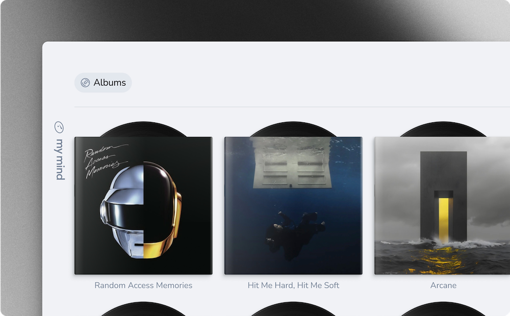 Save a link from Spotify, Apple Music or Soundcloud to mymind, and it shows up beautifully in your mind with its own special card. Tracks, albums and playlists all save uniquely.