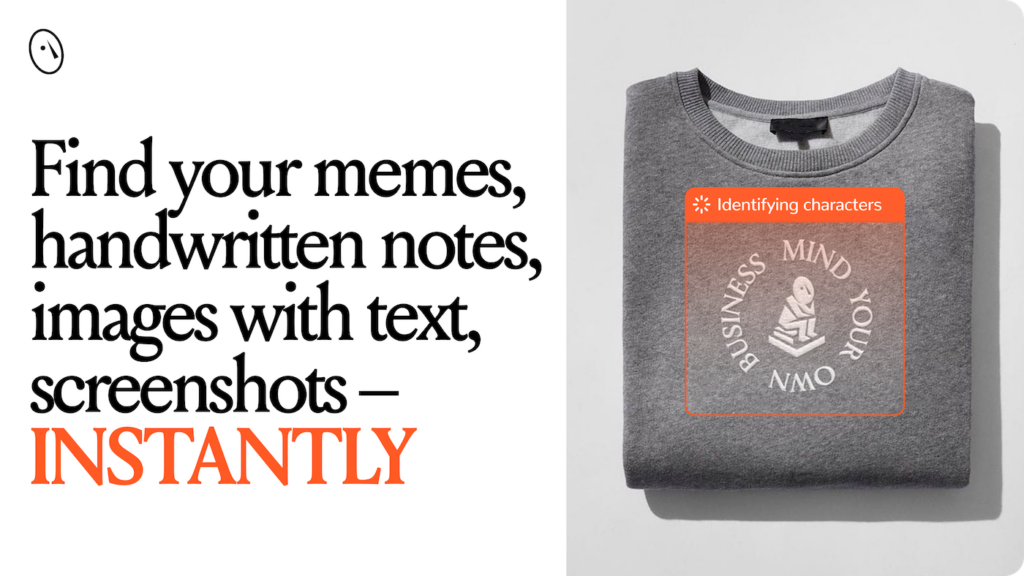 When you save an image containing words to your mind, it will read the image and index the important words so you can find it later. Search any word you can remember, and you'll find it instantly when you need it.