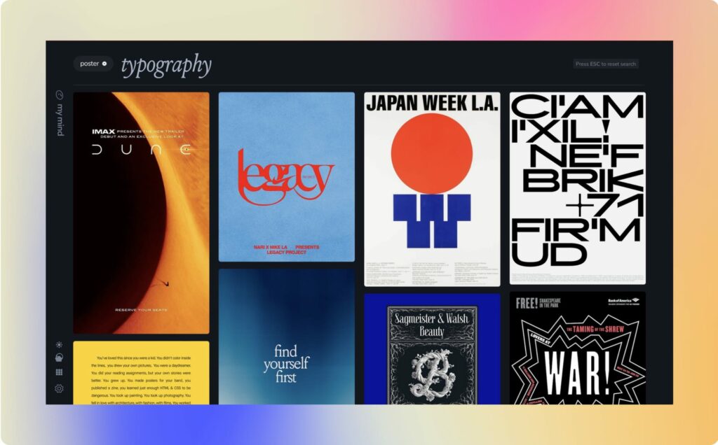 When starting a new project later on, you either search “typeface,” or a specific tag like “poster,” or even just a color, and you instantly have an inspiring mood board for your project.