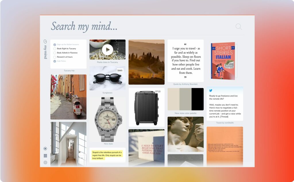 Maybe you do a Google search for scuba diving classes in Santorini. Add that image to your mind. Maybe you think of a renaissance painting that has a sort of gut-punch effect on you. Save to mymind. Maybe it’s a picture of deep dish pizza. Straight into your mind.