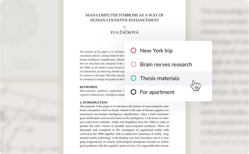 Search “brainwaves” or “PDFs” or #thesis and save it as a Smart Space. If you need to manually add a related item that falls outside those parameters, just right click it and and click “Add to Space.”
