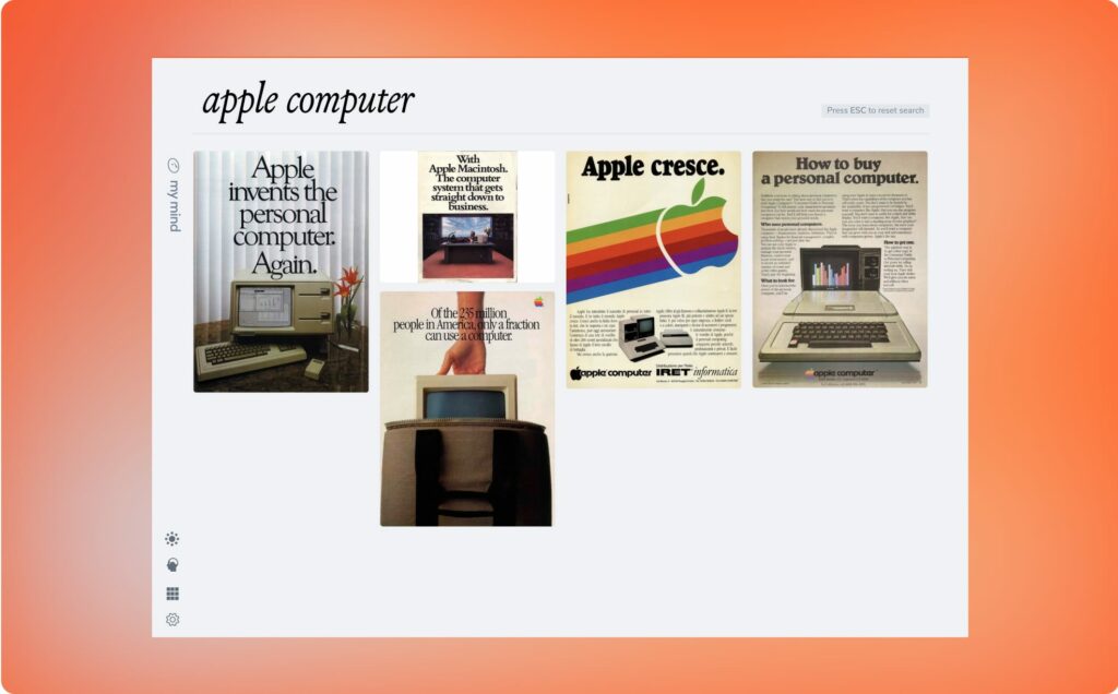 To find inspiration: I’m forever nostalgic for the Golden Age of Advertising, and I often save images of old print ads to inspire me and my copywriter for our own projects. Searching any word I remember from an old add will turn it up instantly.
