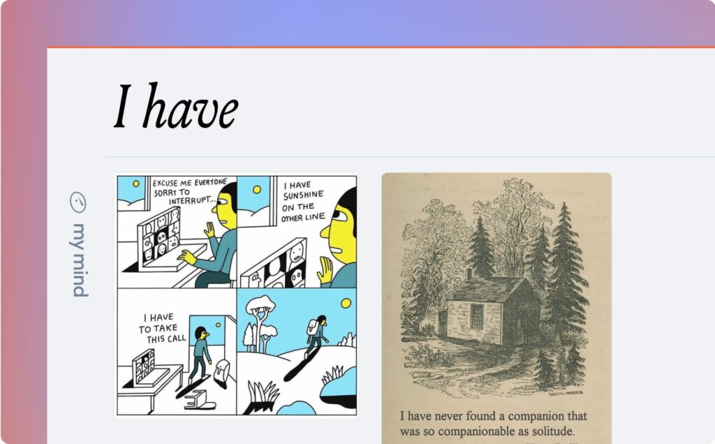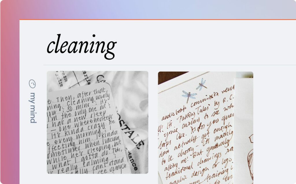 – To find my handwritten notes: Yes, mymind can even scan your handwriting (if it’s reasonably legible handwriting, that is). If I take a photo of a handwritten note or todo list, I can usually find it by searching any word from the note.