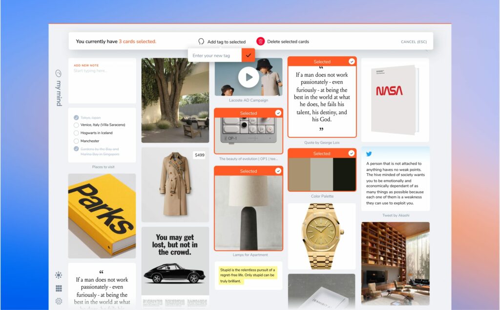 This is especially great for tagging. If you’ve saved multiple cards for a specific work project, for example, you can bulk select them and add the tag “project X.” That tag will be applied to all selected cards.