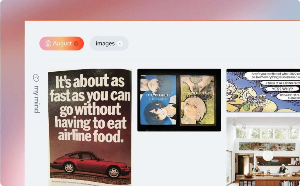 Feeling nostalgic? Search any month like “August” and hit enter, then add “images.” You’ll see all the photos you’ve saved to your mind during that time.