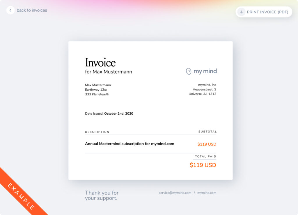 And to make this even easier for you and your accountant, you can now print proper PDF invoices straight from mymind under your account settings. We even allow you to add a custom invoice address.
