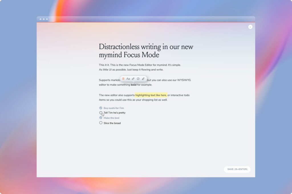 Just click the colorful sphere in the corner of your note (on desktop) to expand it. You can then write to your mind’s content. No clutter. Minimal UI. No feature overload. Pure zen.