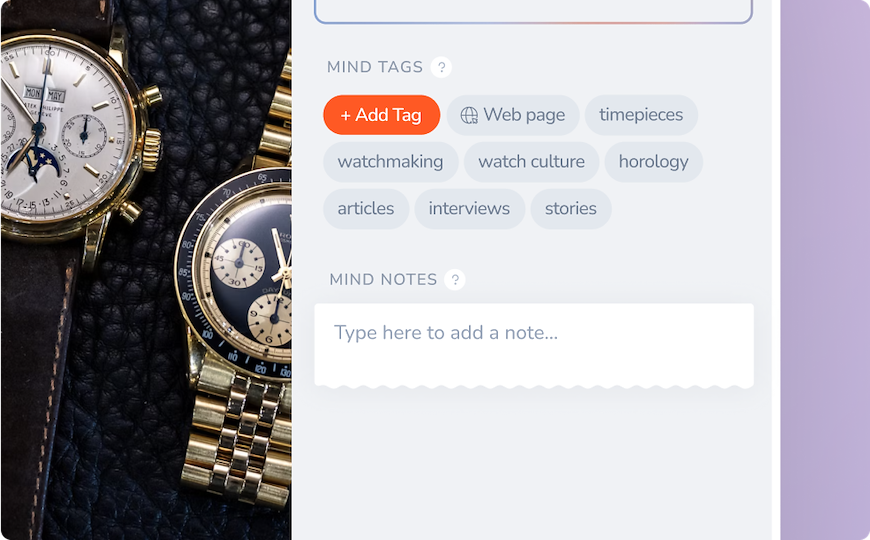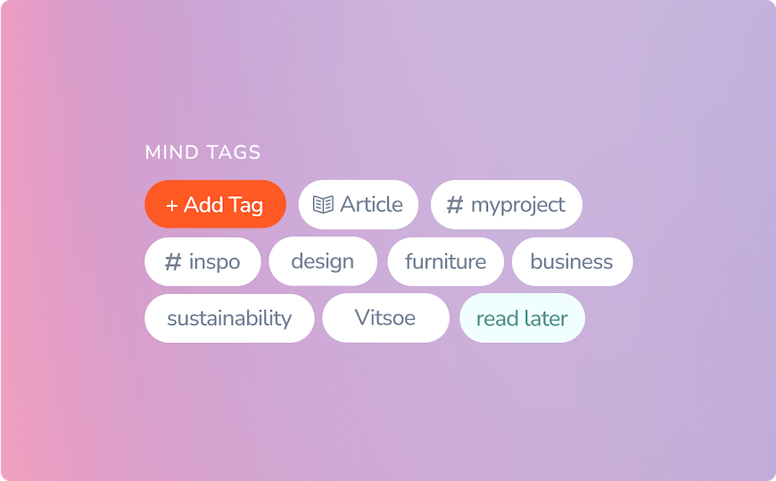 On top of that: mymind now categorizes yours URLs, since not all websites are treated the same. In the sidebar of your website card, you'll now see a special tag & icon labeling it as a webpage, article, product, tweet or other link type. Click the tag bubbles to see more results within that category.