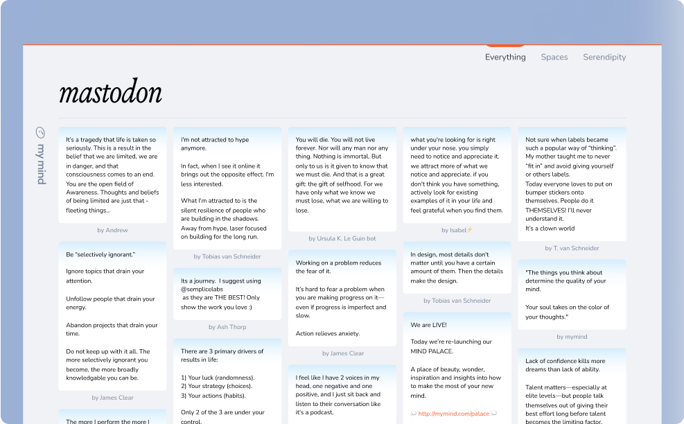 Save a post from Mastodon just like you would save any other URL, by clicking the + sign in your browser via our browser extension. On mobile, select “share” next to the post and choose the mymind app from the share panel.