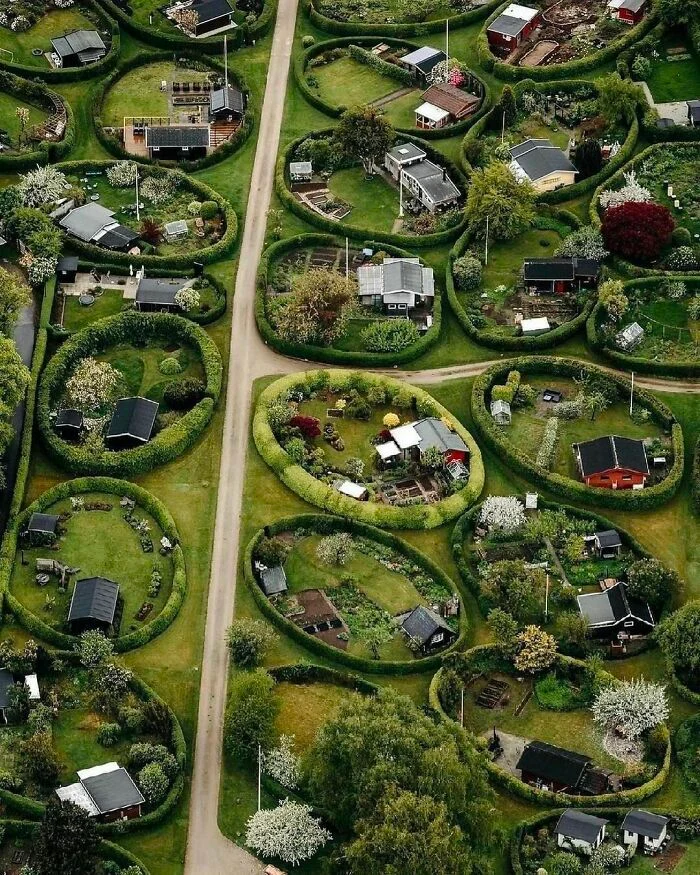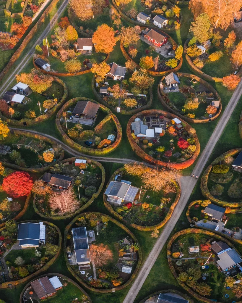 The “round gardens of Denmark” were a project led by landscape architect Søren Carl Theodor Marius Sørensen in 1948. While Sørensen provided loose directions, owners were given free reign to place their cottages and choose their garden hedges, resulting in this terrific visual wonder.