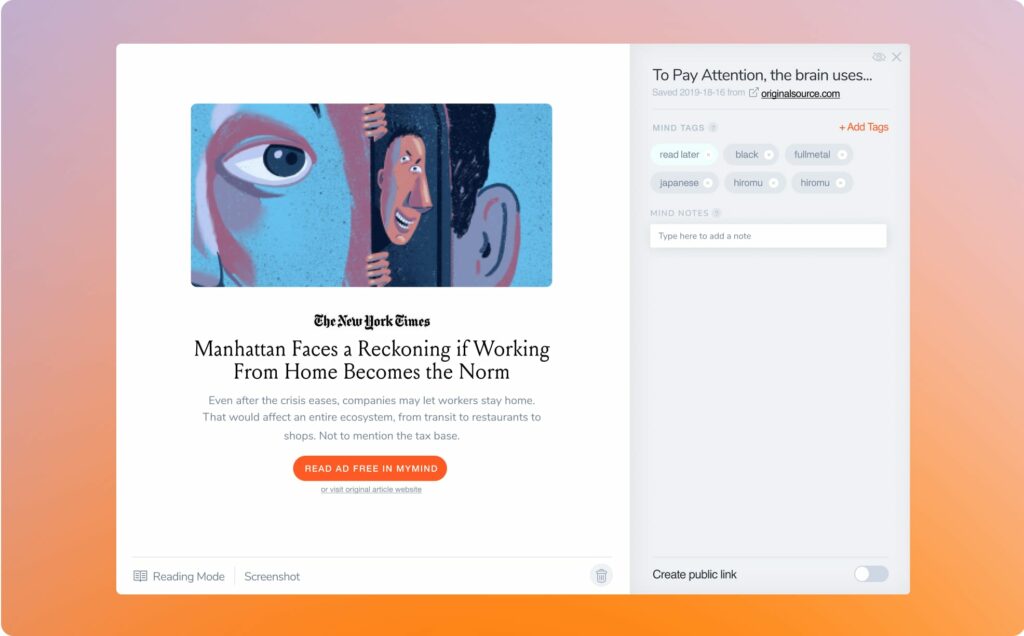 Before, you had to click a link and jump out of mymind to read an article on its original site. Now it’s all within your mind. No external tabs filling your browser (that you’ll ultimately X out of without reading), no runaround.