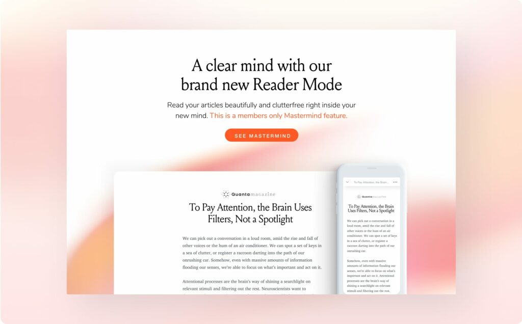 Your mind strips all the extra stuff away from the article and leaves you with a clean, easy-to-read version of the article. No more ads, cluttered design or other distractions.