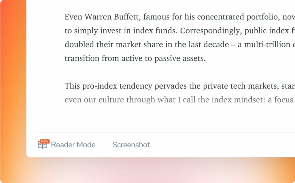 Think of Reading Mode as the cozy corner of your mind. Your mental armchair, where you can sink in and relax with a good article or story. It’s just you and your mind, reading to soak it all in.