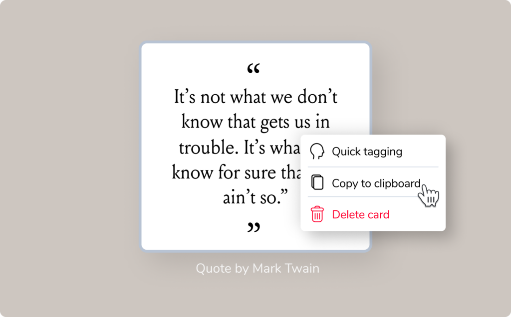 For text cards (like quotes, highlights or notes), you'll see an additional option to copy the card text to your clipboard. Click and only the text will be copied, so you can paste it in a Tweet, message, research paper or elsewhere.