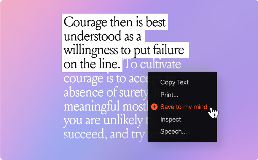 With the mymind browser extension or mobile app installed, you can save quotes, feedback, notes or any other text to your mind without losing focus.