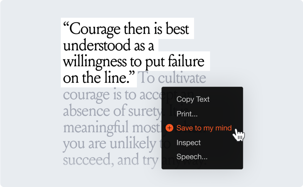 First, install our browser extension. Then highlight the text, quotation marks included, and right click to save a sentence or passage to your mind as a quote. (Without the quotation marks, it will be saved as a highlight.)