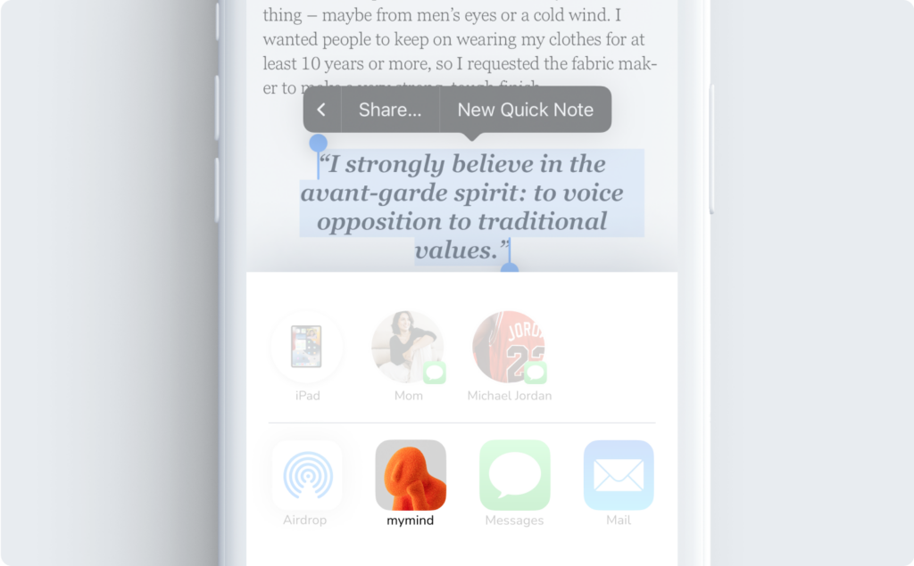 Select the text, being sure to include the quotation marks again, and select Share from the options that appear. Share it to the mymind app (get the iOS app here or our Android app here).