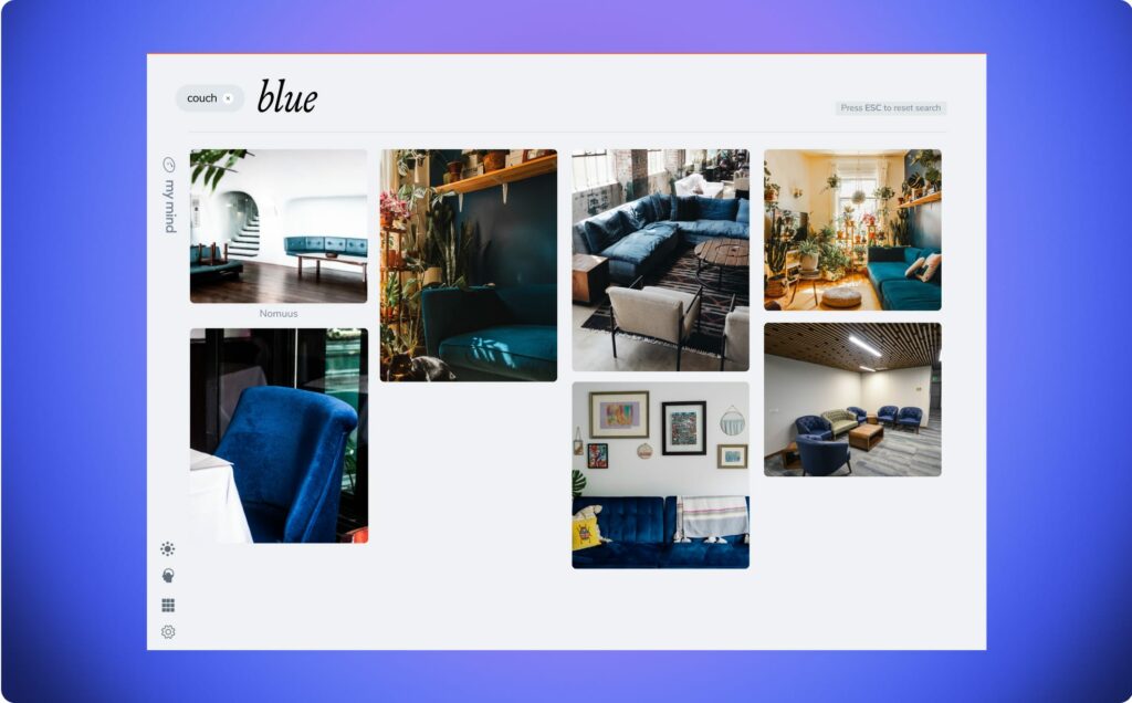 Say you’re decorating your apartment and saved multiple options for your couch. Search the word COUCH, press enter and add BLUE (or any color). You’ll then only see blue couches.