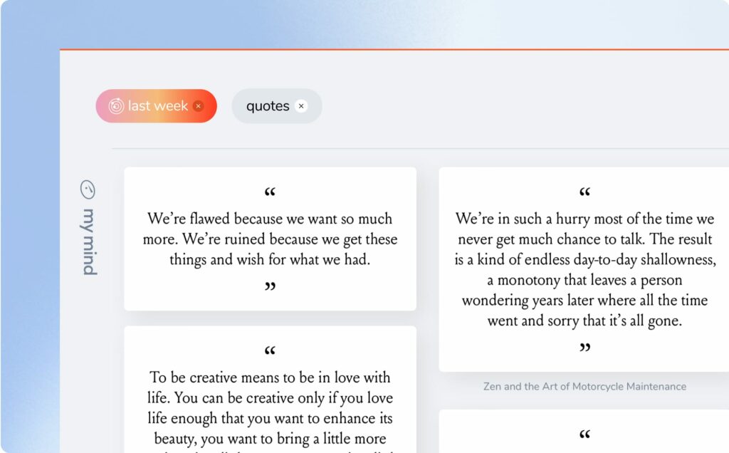 Trying to remember a specific quote you read last week, but can’t recall a keyword? Search LAST WEEK, hit enter and add QUOTES. You’ll then see only the quotes you saved last week. (This is a time travel deep search, which we’ll dig into more soon.)