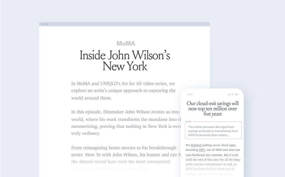 We stopped keeping browser tabs open years ago. One click and it's archived in our minds, where we can find it – and actually read it – later. Once you use mymind as a reading app, you won't know how you ever did it any other way.