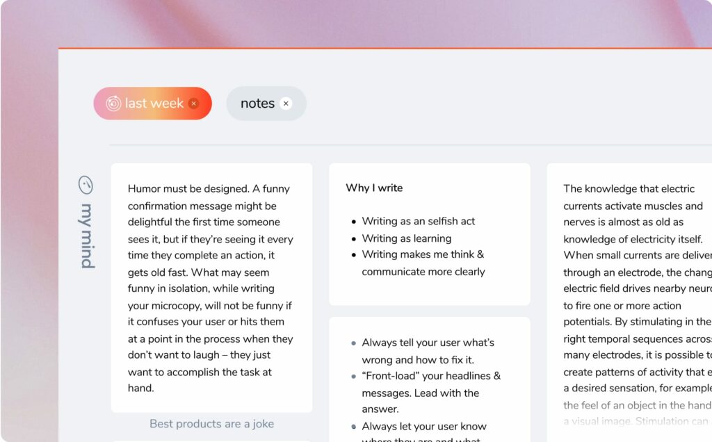 Need notes from your work call last week? Search “last week” to see only the things you saved last week to your mind. Or even better, search “last week,” hit enter and add “notes.”