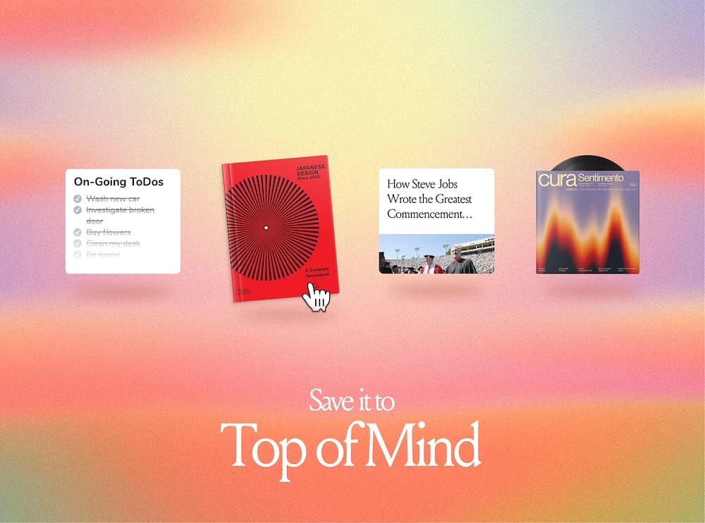 Have a todo list you want to prioritize this week? Or a quote that's motivating you? Or an article you want to read? Drag and drop it under the search bar to put it on the top shelf of your mind.