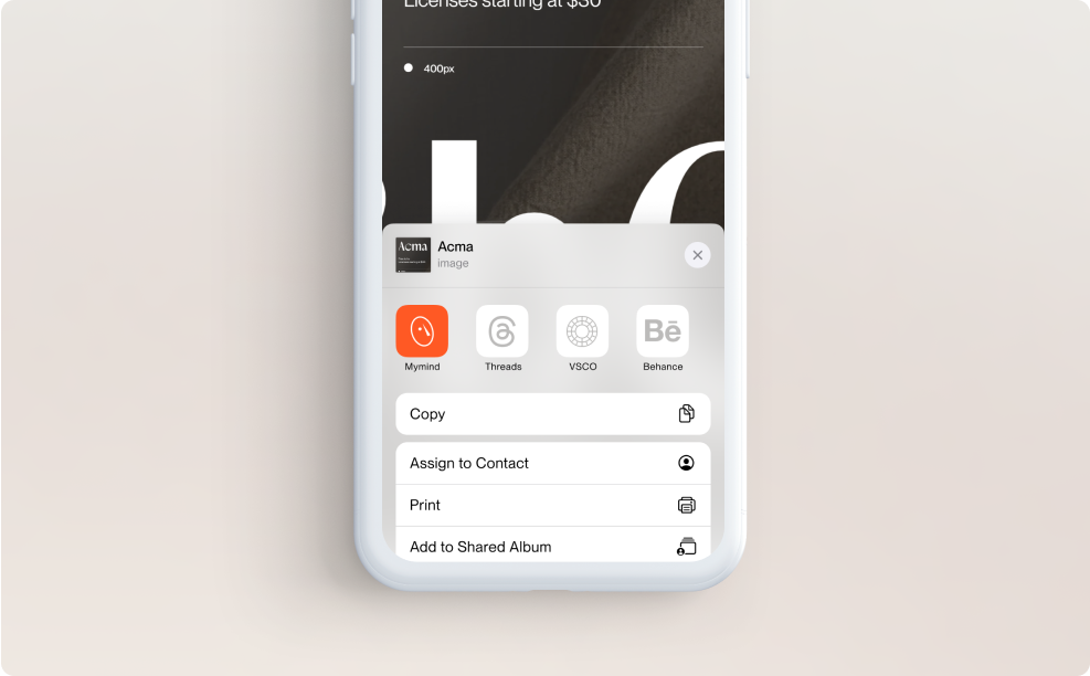✦ With the mymind iOS or Android app installed, saving screenshots takes a second. Just share it to your mind like you'd share anything else on mobile.
